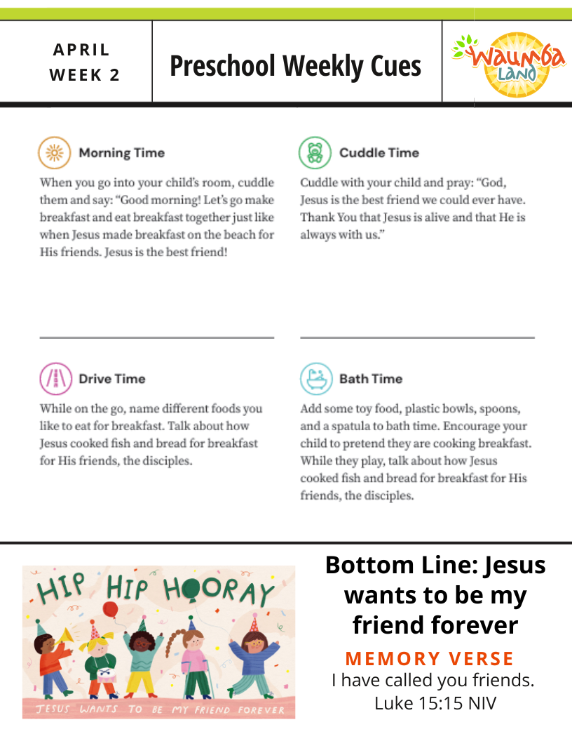 Peter and some of the disciples go fishing, but they don’t catch anything. A man on the shore tells them to cast their nets again but on the other side of the boat, and then they catch tons of fish! The disciples realize the man on the shore is Jesus, and Peter jumps into the water and swims to the shore. Jesus cooks breakfast and eats with His friends on the beach. Jesus loves spending time with us, too, because Jesus wants to be my friend forever!